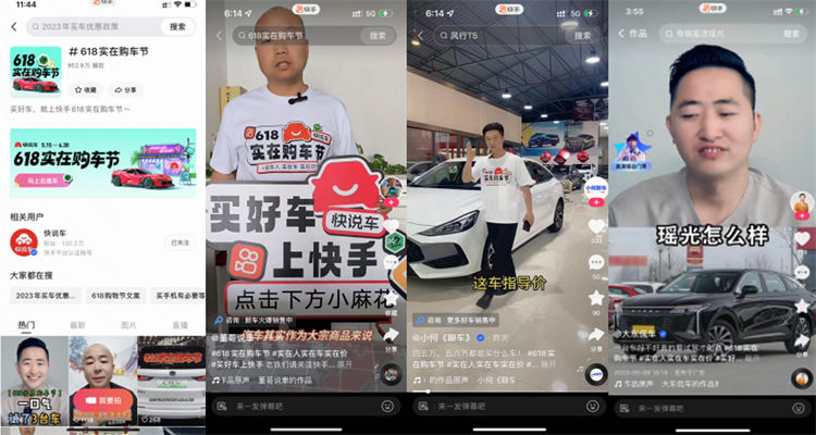 為緊貼用戶線上實(shí)際購(gòu)車鏈路,真實(shí)沉淀潛客,快說(shuō)車調(diào)動(dòng)站內(nèi)1000+位車經(jīng)紀(jì)人打造30天不間斷直播,從活動(dòng)認(rèn)知、車型種草,到深度激發(fā)興趣、補(bǔ)貼轉(zhuǎn)化,依托快手高信任感社區(qū)生態(tài)優(yōu)勢(shì),通過(guò)種收結(jié)合的“超長(zhǎng)直播”鏈路,在車經(jīng)紀(jì)人直播間實(shí)現(xiàn)轉(zhuǎn)化成交,為品牌解鎖生意增長(zhǎng)。同時(shí),快說(shuō)車組織10000+新車創(chuàng)作者卷入活動(dòng)流量池,在#618實(shí)在購(gòu)車節(jié)、#買好車上快手、#實(shí)在人實(shí)在價(jià)實(shí)在車等細(xì)分話題下輸出專業(yè)視頻內(nèi)容,營(yíng)造活躍氛圍,加速活動(dòng)期間營(yíng)銷勢(shì)能的釋放,另一方面也充分滿足了消費(fèi)者看車、選車、買車的需求。
