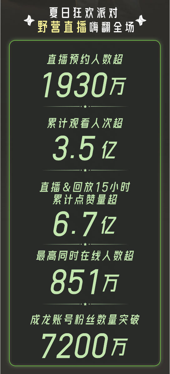 據(jù)戰(zhàn)報(bào)顯示,成龍夏日狂歡派對(duì)直播間累計(jì)觀看人次超3.5億,最高同時(shí)在線在觀看人數(shù)超851萬,有超過1930萬快手用戶成功預(yù)約此次的「野營談唱會(huì)」。而在直播期間,成龍的快手賬號(hào)粉絲數(shù)飆升,新增1000多萬粉絲。截至目前,成龍的快手賬號(hào)粉絲量已突破7200萬,成為當(dāng)前快手站內(nèi)粉絲量最多的明星賬號(hào)。不管是大家心目中當(dāng)之無愧的“大哥”,還是快手老鐵更喜歡稱呼的“龍叔”,成龍?jiān)诳焓钟谜嫘膹V結(jié)天下老鐵。