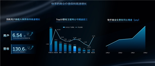 報(bào)告數(shù)據(jù)顯示,隨著短視頻直播平臺向互聯(lián)網(wǎng)基建發(fā)展,快手的用戶規(guī)模和用戶粘性將繼續(xù)保持穩(wěn)定增長。伴隨而來的,便是快手商業(yè)價(jià)值的同步增長,2023年第一季度,快手平均月活用戶量達(dá)到6.45億,營銷服務(wù)收入則達(dá)到130.6億,在短視頻賽道處于優(yōu)勢地位。