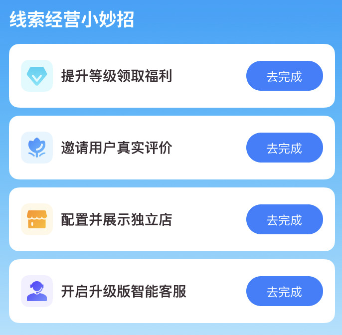 比如,針對商家的技能提升需求,活動通過下發(fā)任務(wù)(提升等級、邀請用戶真實評價、配置并展示獨立店、開啟升級版智能客服等),激勵商家掌握線索經(jīng)營小妙招的同時,獲得成長福利。