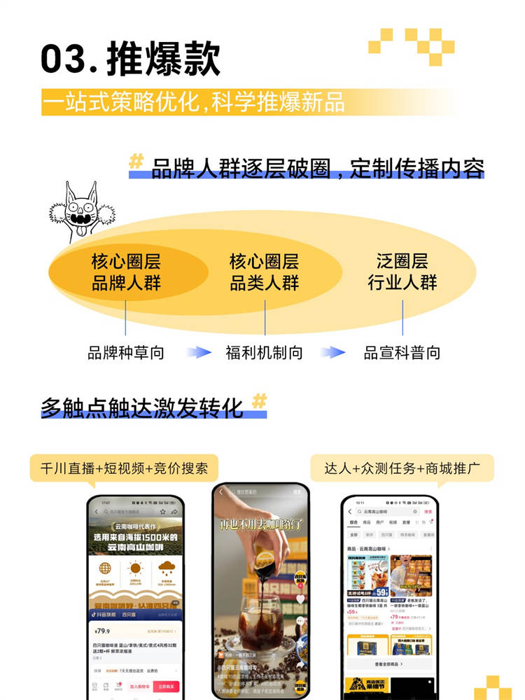 3:針對“場”,直播間背景重點(diǎn)展示咖啡豆采摘實(shí)景及0糖0脂等賣點(diǎn),突顯品牌形象。搭配短視頻與搜索營銷組合,引流直達(dá)成交頁面,極大提效后鏈路轉(zhuǎn)化。