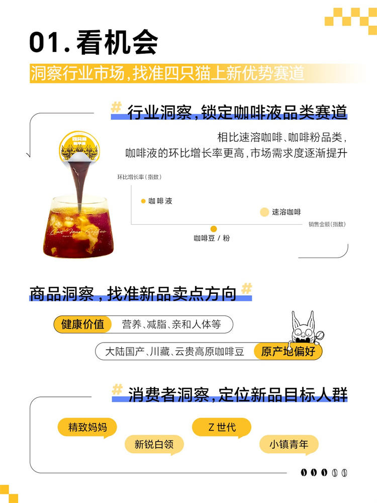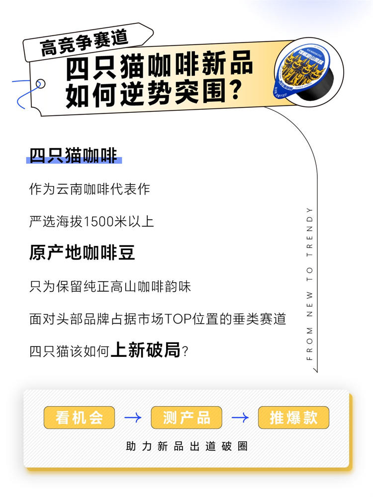 嚴(yán)選海拔1500米以上原產(chǎn)地咖啡豆,只為造就具有獨(dú)特高山韻味的四只貓咖啡,致力于成為“云南咖啡”代表作。然而對于剛完成品牌煥新,在行業(yè)中等同于“白牌”的四只貓,當(dāng)全新咖啡液產(chǎn)品上市,怎樣才能快速打破行業(yè)競爭壁壘,讓新品順利突圍,實(shí)現(xiàn)人群破圈、生意提效?