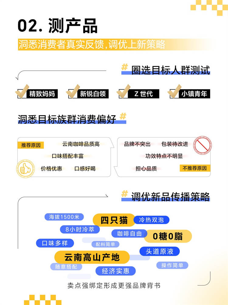 同時(shí),大部分已購人群會(huì)向好友推薦四只貓,認(rèn)為云南咖啡價(jià)格優(yōu)惠、口味搭配豐富、口感好喝,但也有消費(fèi)者覺得品牌不夠突出,功效特點(diǎn)不明顯,擔(dān)心品質(zhì)。新品實(shí)驗(yàn)室給出了傳播調(diào)優(yōu)方向,即放大產(chǎn)地優(yōu)勢,升級(jí)產(chǎn)品賣點(diǎn),強(qiáng)化品牌差異,并通過更精細(xì)的直播運(yùn)營、更多觸點(diǎn)的推廣,加速新品出道。
