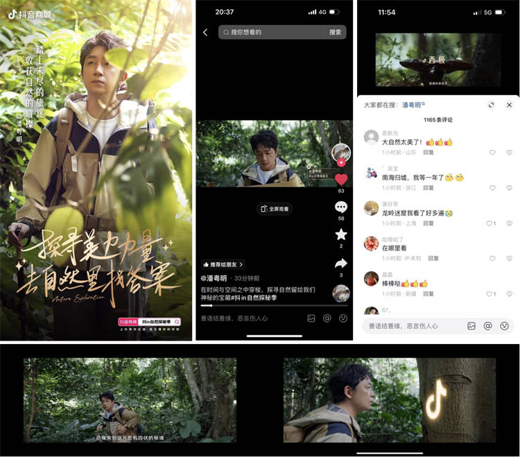 在活動(dòng)先導(dǎo)短片上線的同期階段,平臺(tái)側(cè)一并搭建#抖in自然探秘季#話題頁,該話題頁下蕓聚潘粵明、陳意涵,王鶴潤(rùn)等明星藝人的打call視頻,播散活動(dòng)主旨,最大范圍內(nèi)聚集藝人影響力,為活動(dòng)引流造勢(shì),提升IP熱度。