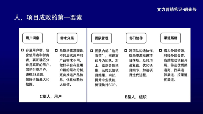 結(jié)合自己目前有限的經(jīng)驗,從5個視角對“人”做了梳理。分別是用戶洞察、需求分層、團(tuán)隊管理、部門協(xié)作、渠道拓建。用戶洞察、需求分層偏向用戶本身。團(tuán)隊管理、部門協(xié)作、渠道拓建偏向組織層面。