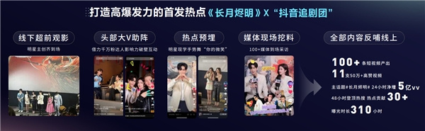 第一,要打造高爆發(fā)力的首發(fā)熱點(diǎn),“抖音追劇團(tuán)”是良好的線下營銷方式。《長月燼明》組織的線下超前觀影活動(dòng)中,有頭部大V助陣、熱點(diǎn)現(xiàn)場預(yù)埋、媒體當(dāng)場挖料等環(huán)節(jié),而這些內(nèi)容則全部反哺線上,產(chǎn)出短視頻百余條,實(shí)現(xiàn)主話題24小時(shí)內(nèi)凈增5億曝光量。