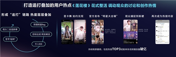 第三,要打造追打疊加的用戶熱點(diǎn),通過預(yù)埋明星flag、網(wǎng)友喊話、藝人回應(yīng)、官號助推、觀眾二創(chuàng)造新梗的“追打”鏈路持續(xù)進(jìn)行熱度發(fā)酵。比如《蓮花樓》花式整活,昆卡舞如約兌現(xiàn),官方發(fā)布“明星混剪大合集”,讓觀眾捕捉到新梗,從而不斷打造出新的熱點(diǎn)話題,最終實(shí)現(xiàn)了持續(xù)刷屏霸榜、包攬熱榜TOP3、主演成毅單條視頻播放量破億的熱度成就。