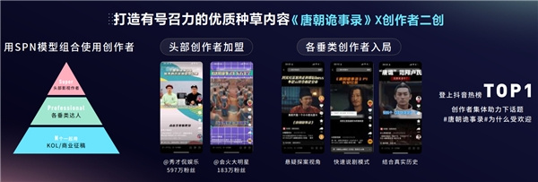 第二,要打造有號召力的優(yōu)質(zhì)種草熱點(diǎn),創(chuàng)作者二創(chuàng)是突破圈層的關(guān)鍵營銷方式。在選擇創(chuàng)作者時(shí)可使用SPN模型,組合邀請創(chuàng)作者共創(chuàng)。比如《唐朝詭事錄》邀請頭部影視創(chuàng)作者加盟,并采用各垂類創(chuàng)作者入局模式,充分解讀劇集的種種細(xì)節(jié),助推話題 #唐朝詭事錄為什么受歡迎 登上抖音熱榜TOP1。