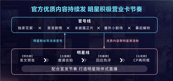 具體而言,明星賬號要和官號相互協(xié)同,官方優(yōu)質(zhì)內(nèi)容要持續(xù)發(fā)布,明星要積極營業(yè)卡節(jié)奏,吸引用戶持續(xù)追劇。明星可以幫助官號引流,官號的優(yōu)質(zhì)內(nèi)容也可以幫助明星持續(xù)擴(kuò)大粉絲盤。