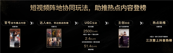 ? 短視頻陣地協(xié)同玩法,助推熱點(diǎn)內(nèi)容登榜:比如由官抖發(fā)布熱梗短視頻,通過(guò)抖音平臺(tái)內(nèi)的全民挑戰(zhàn)特色玩法,刺激大量UGC內(nèi)容產(chǎn)生,借助明星的呼應(yīng),助推熱點(diǎn)內(nèi)容登榜,擴(kuò)大影片的用戶基本盤(pán)。