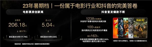 2023年的暑期檔為中國(guó)電影打了一針強(qiáng)心劑。206.18億的總票房、5.04億的總觀影人次均成為內(nèi)地影史同檔期最高紀(jì)錄。在電影行業(yè)再次走向輝煌的背后,整個(gè)的宣發(fā)環(huán)境發(fā)生了巨大變化。在此背景下,9月20日,抖音在北京舉辦了電影秋季閉門(mén)會(huì),向行業(yè)宣講了電影宣發(fā)的新趨勢(shì),并通過(guò)發(fā)布更多的好內(nèi)容、好產(chǎn)品、好政策、好方法,助力中國(guó)電影市場(chǎng)打造更多爆款。