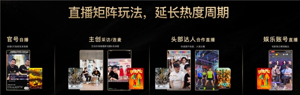 ? 直播矩陣玩法,延長(zhǎng)熱度周期:電影宣發(fā)方可借助抖音直播的形式,比如頭部達(dá)人合作直播、娛樂(lè)賬號(hào)直播或官抖自主直播,為觀眾打造沉浸式的電影宣發(fā)體驗(yàn),進(jìn)一步延長(zhǎng)熱度周期。