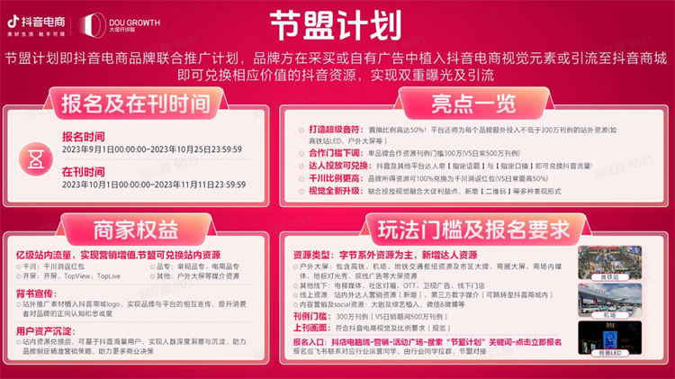「節(jié)盟計劃」作為抖音電商品牌聯(lián)合推廣計劃,以資源置換的方式,幫助品牌在抖音電商平臺獲取更多資源。活動期間, 品牌方在站外采買或自有廣告中植入抖音電商視覺元素或引流至抖音商城,即可兌換相應價值的抖音資源,提升品牌曝光并引流到品牌自有私域流量池,提升消費者對品牌的正向認知和忠誠度。