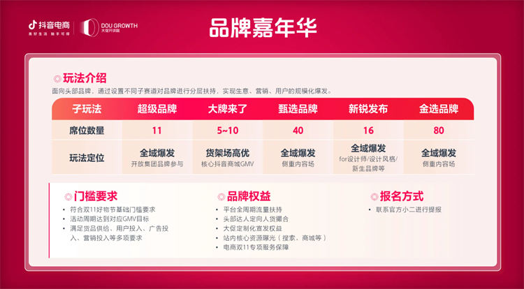 其中,「品牌嘉年華」是抖音電商專門面向頭部品牌推出的玩法,通過設置不同子賽道對品牌分別給予扶持。各賽道頭部品牌可借助平臺全周期流量扶持、頭部達人撮合、大促定制化宣發(fā)、站內(nèi)核心資源曝光(搜索、商城等)以及電商雙11專項服務保障等專屬權(quán)益,搶占用戶注意力、快速提升種草人群規(guī)模,實現(xiàn)生意、營銷、用戶的規(guī)模爆發(fā)。