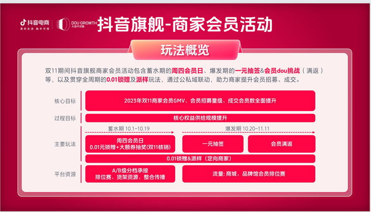 此次大促,平臺推出「抖音旗艦-商家會員」活動,以“周四會員日”和抖音旗艦-商家會員DOU挑戰(zhàn)”玩法,通過0.01元鎖贈和大額券抽獎、大額優(yōu)惠券等形式,幫助品牌沉淀品牌私域流量池,做好蓄水期的準備;推出“抖音旗艦-抽簽&試用”玩法,以「一元抽簽活動」和「大牌試用」等形式,激發(fā)用戶參與欲望,快速提升拉新效率,助推品牌實現(xiàn)爆發(fā)期的生意躍遷;并以抖音旗艦-商家會員成交排位賽,為品牌提供流量激勵,保持品牌的持久曝光。