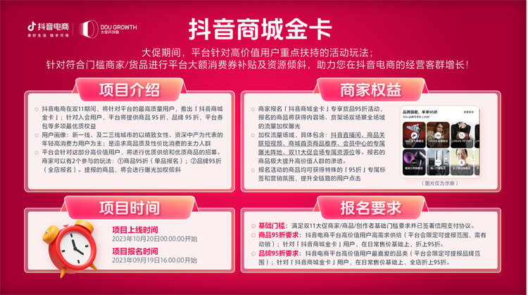 其中,「抖音商城金卡」以95折扣玩法(部分商品),幫助參與該玩法的品牌匯聚新一線及二三城市的精致女性、資深中產(chǎn)等高質(zhì)量用戶。活動期間,品牌可提報申請參與「抖音商城金卡」玩法,直接提升品牌在高質(zhì)量用戶人群中的集中曝光,實現(xiàn)經(jīng)營客群增長。