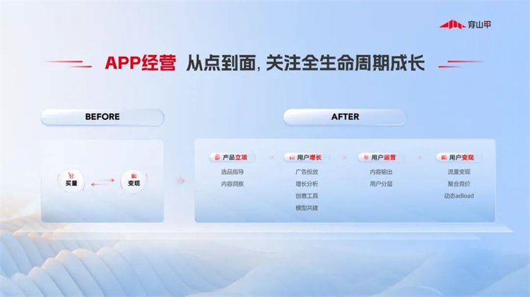 AdSpark是在原增長(zhǎng)參謀上升級(jí)而來(lái),還提供免費(fèi)的全渠道廣告歸因監(jiān)測(cè)和全域數(shù)據(jù)分析。對(duì)于開(kāi)發(fā)者,AdSpark坐擁打通投變雙端的數(shù)據(jù)底座和算法模型,在買量全過(guò)程中可以立體地進(jìn)行分析,并根據(jù)投放目標(biāo)提供投放策略,實(shí)現(xiàn)精準(zhǔn)投放。未來(lái),對(duì)于廣大想進(jìn)軍混合賽道的開(kāi)發(fā)者,還將可以做到深度定制投放策略。