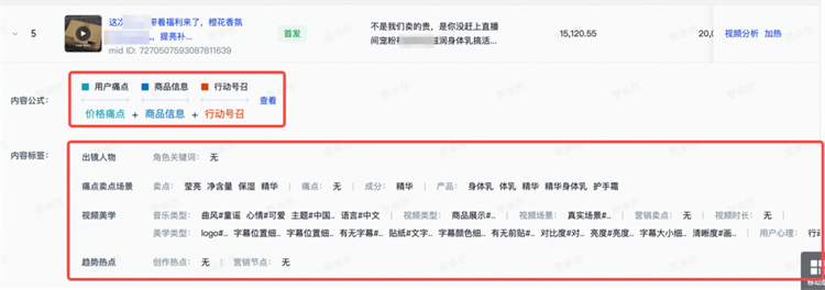同時借助AI能力和語意識別能力,內(nèi)容實(shí)驗(yàn)室還能提取素材提及的內(nèi)容標(biāo)簽和帶有時序的內(nèi)容公式結(jié)構(gòu),用戶一眼就能看到行業(yè)種草內(nèi)容的視頻結(jié)構(gòu)和所講內(nèi)容;