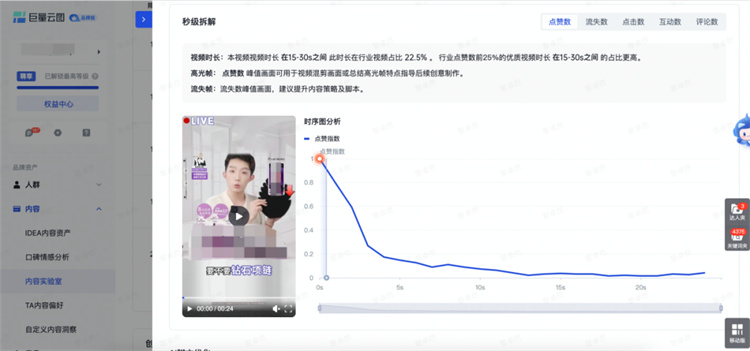 結(jié)合視頻的秒級數(shù)據(jù),我們可以定位視頻的高光畫面和低流失畫面,作為混剪和原創(chuàng)素材的畫面靈感;