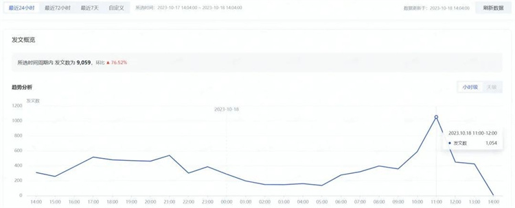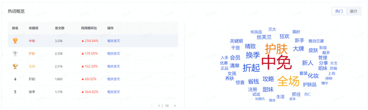 大促期間,也可以通過“實(shí)時熱點(diǎn)”模塊監(jiān)測品牌的小時級聲量,并參考相關(guān)熱門關(guān)鍵詞,及時追熱點(diǎn)、拓聲量。