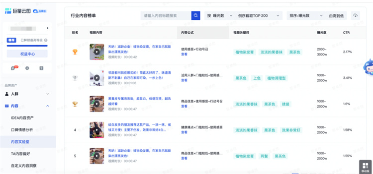 那我們要如何制作優(yōu)質(zhì)種草內(nèi)容來觸達(dá)用戶呢?可以在巨量云圖的「內(nèi)容實(shí)驗(yàn)室 - 行業(yè)靈感激發(fā)」的視頻榜單中,選擇與品牌同品類的視頻,并且通過互動指標(biāo)排序表現(xiàn)較好的行業(yè)熱門視頻進(jìn)行拆解分析。