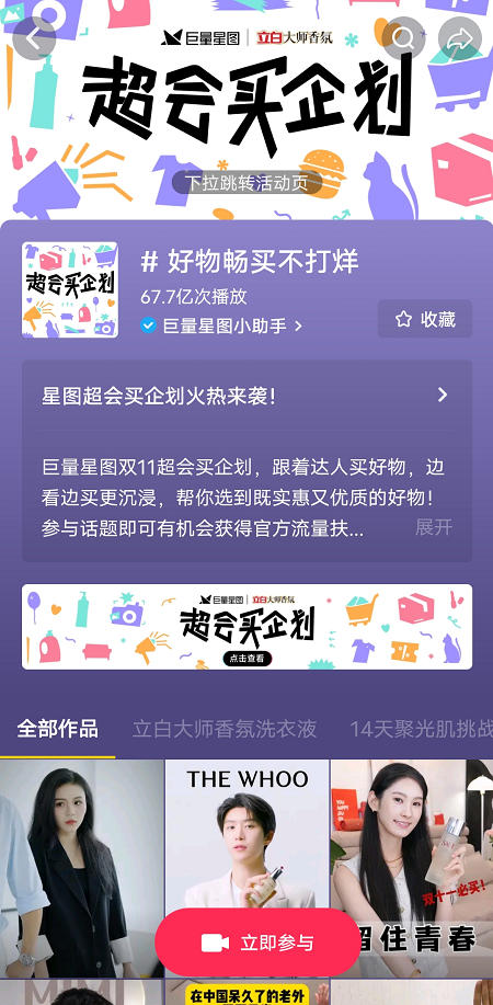 圍繞品牌沖刺雙11的需求,巨量星圖推出「雙11超會買企劃」活動,打造大聲量種草陣地,構(gòu)建人貨匹配交互場域,助力立白等諸多品牌實現(xiàn)大促節(jié)點生意爆發(fā)目標(biāo)。在內(nèi)容傳播上,活動創(chuàng)建熱點話題,聚合海量優(yōu)質(zhì)達(dá)人精準(zhǔn)覆蓋多圈層、多消費層級用戶,加深好物種草心智;在資源扶持上,大促專屬禮包、多項權(quán)益扶持,降低品牌達(dá)人營銷成本,挖掘出更多種草轉(zhuǎn)化機(jī)會。