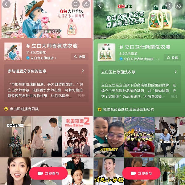 立白品牌傳播部和立白電商內(nèi)容團(tuán)隊聯(lián)動上百位優(yōu)質(zhì)達(dá)人發(fā)布種草視頻,其中品牌傳播部聚焦超頭部&頭部高調(diào)性達(dá)人,以高級感、潮流感的視覺內(nèi)容,形式巨大品牌勢能;電商內(nèi)容團(tuán)隊則以肩、腰、尾達(dá)人矩陣為主,引導(dǎo)完成銷售轉(zhuǎn)化。內(nèi)容覆蓋劇情類、母嬰類、科普類、口播類、生活類等五大賽道。通過規(guī)?;倪_(dá)人合作,打造出大聲量的內(nèi)容矩陣,并在短時間內(nèi)反復(fù)輻射、觸達(dá)不同品類的核心客群,讓品牌和用戶之間的溝通路徑更順暢,實現(xiàn)品牌的深度種草。截止到目前,話題#立白大師香氛洗衣液 、#立白衛(wèi)仕除菌洗衣液分別收獲11.3億次、5.4億次播放量。