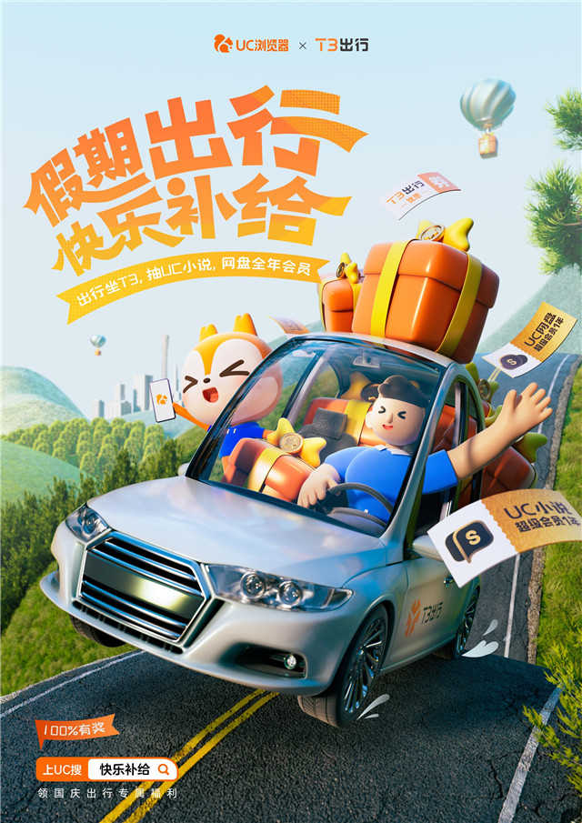 今年中秋國慶雙節(jié)之時,UC瀏覽器就洞察到用戶的出行痛點,聯(lián)合T3出行,用豐富好用的小說、播放器、網(wǎng)盤功能,搭配T3出行大額出行券包,還用有趣實用的出行實物裝備,讓用戶在假期的排隊堵車焦躁等待時間、內(nèi)存不足的焦慮時刻,用海量小說一鍵暢聽、精彩視頻流暢播放、超大內(nèi)存自動備份的好用功能,實現(xiàn)愉快出游。