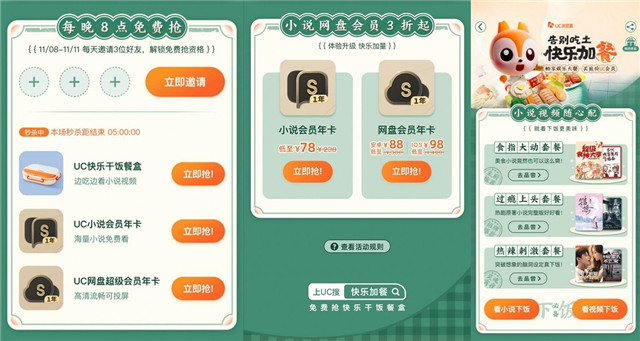 更有驚喜福利快樂加碼,11.8-11.11上UC搜“快樂加餐”,邀請好友獲取抽獎機會,每晚20點即可免費搶UC小說、UC網(wǎng)盤全年會員和限量快樂干飯餐盒。