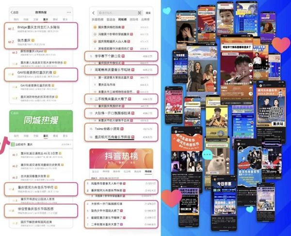 從營銷傳播角度來看,音樂節(jié)影響力(曝光量級數(shù)據(jù)、線下地標(biāo)大曝光)銀河方舟音樂節(jié)X抖音汽車嘉年華的聯(lián)合總曝光量達110.6億次,其中包含#半個音樂圈都來重慶了#等超90次微博抖音的熱搜,#銀河方舟音樂節(jié)#在微博抖音的相關(guān)話題增長了2.3億。尤其是在抖音平臺,此次音樂節(jié)的線上直播就曝光了5.4億次。