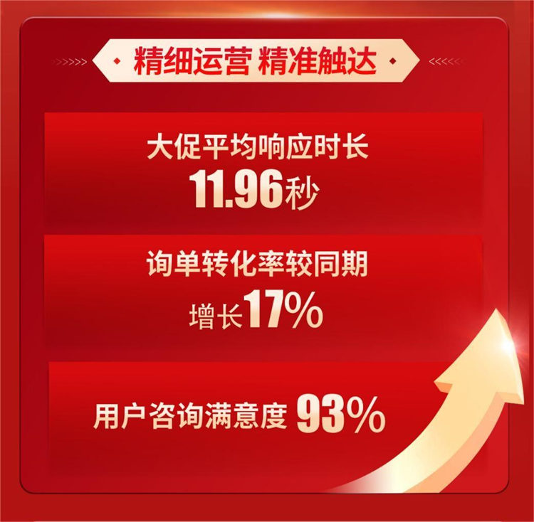 森歌將“冠軍級的體驗(yàn)式服務(wù)”放在戰(zhàn)略層面的企業(yè),將主動(dòng)式高質(zhì)服務(wù)貫徹全流程、全鏈路。什么是冠軍級的體驗(yàn)式服務(wù),用數(shù)據(jù)說話。以本次雙十一來說,大促平均響應(yīng)時(shí)長11.96秒,咨詢轉(zhuǎn)化率較同期增長17%,用戶咨詢滿意度高達(dá)93%。數(shù)據(jù)背后,彰顯的是森歌“更快、更好、更專業(yè)”的服務(wù)追求。