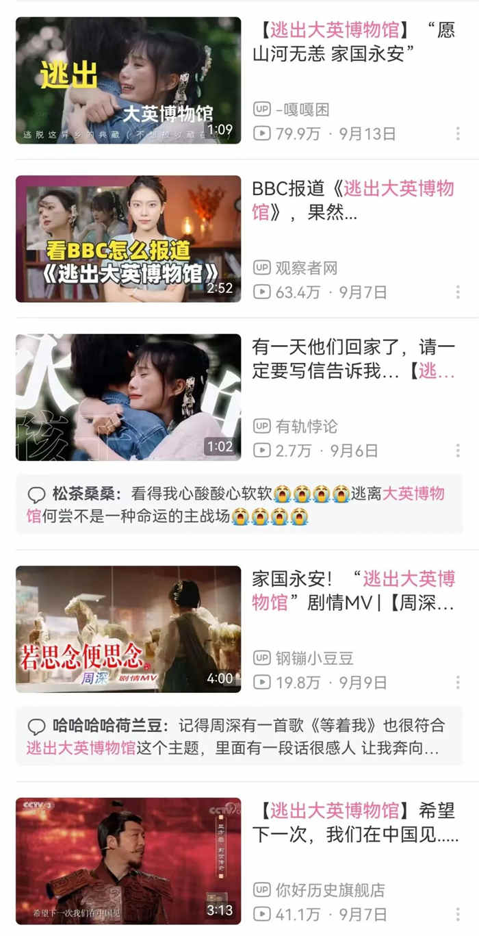 典型如今年的爆款短劇作品《逃出大英博物館》,便是在短劇用戶熟悉的古風甜寵內(nèi)容中,加入了濃烈的家國情懷,結(jié)合對“文物回歸”議題的關(guān)注,通過文物擬人的方式,將短劇的情感從小情變?yōu)榇髳?,也成功實現(xiàn)了全網(wǎng)走紅,收獲了人民日報、人民網(wǎng)、央視等多家官媒的稱贊。