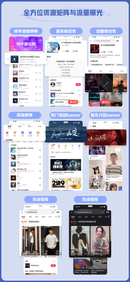在資源矩陣上,快手音樂「π」計(jì)劃將覆蓋快手熱歌榜單、音樂標(biāo)簽頁(yè)、話題聚合頁(yè)、風(fēng)格榜單、熱門活動(dòng)banner、音樂分區(qū)banner、熱點(diǎn)提報(bào)等多個(gè)平臺(tái)優(yōu)勢(shì)資源位,全面提高好歌曝光度。