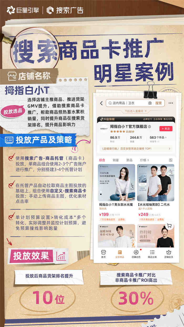 同樣借助搜索商品卡推廣拓展商城流量,搶占生意爆發(fā)先機的還有服飾品牌拇指白小T。拇指白小T通過搜索商品卡推廣為主推的單品預熱蓄水并累計銷量,成功將主推單品的商品貨架排名提升10位,ROI相比非商品卡推廣高出30%。
