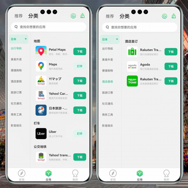 下載好常用的應用外,咱們出行海外,可能特定國家還會有當?shù)爻S玫囊恍┬”夾PP,如果不知道下載哪些得話,還可以通過出境易的分類應用下的國家地區(qū)推薦來下載,例如年底計劃去日本北海道旅行得話,就可以通過推薦下載日本地區(qū)常用的地圖軟件Yahoo地圖,坐地鐵常用的換乘案內,和社交聊天常用的LINE以及預訂民宿時常用的樂天旅行等應用,下載好后落地日本即可打開使用,方便又省心。