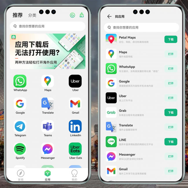 出境易是一款海外出行必備APP,不管是華為手機系統(tǒng)還是安卓手機系統(tǒng)有無谷歌框架的都可以直接在應用內下載谷歌商店上架的應用,例如全球通用的寶藏地圖軟件Google Maps、海外通訊和聊天常用的whatsApp、跟國外友人交流溝通會用到的翻譯軟件Translate還有娛樂社交分享常用的Instagram和Twitter都可以直接下載到手機。