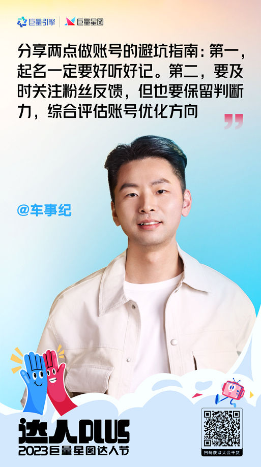 如今,越來(lái)越多的創(chuàng)作者選擇達(dá)人這份事業(yè),并為熱愛而努力著。本次巨量星圖達(dá)人節(jié)上,王七葉、車事紀(jì)、大能、七顆猩猩、放揚(yáng)的心心等達(dá)人,共同圍繞賬號(hào)成長(zhǎng)如何突破瓶頸期、內(nèi)容和商業(yè)化如何平衡等話題,分享了他們的“成長(zhǎng)心得”和“避坑指南”。