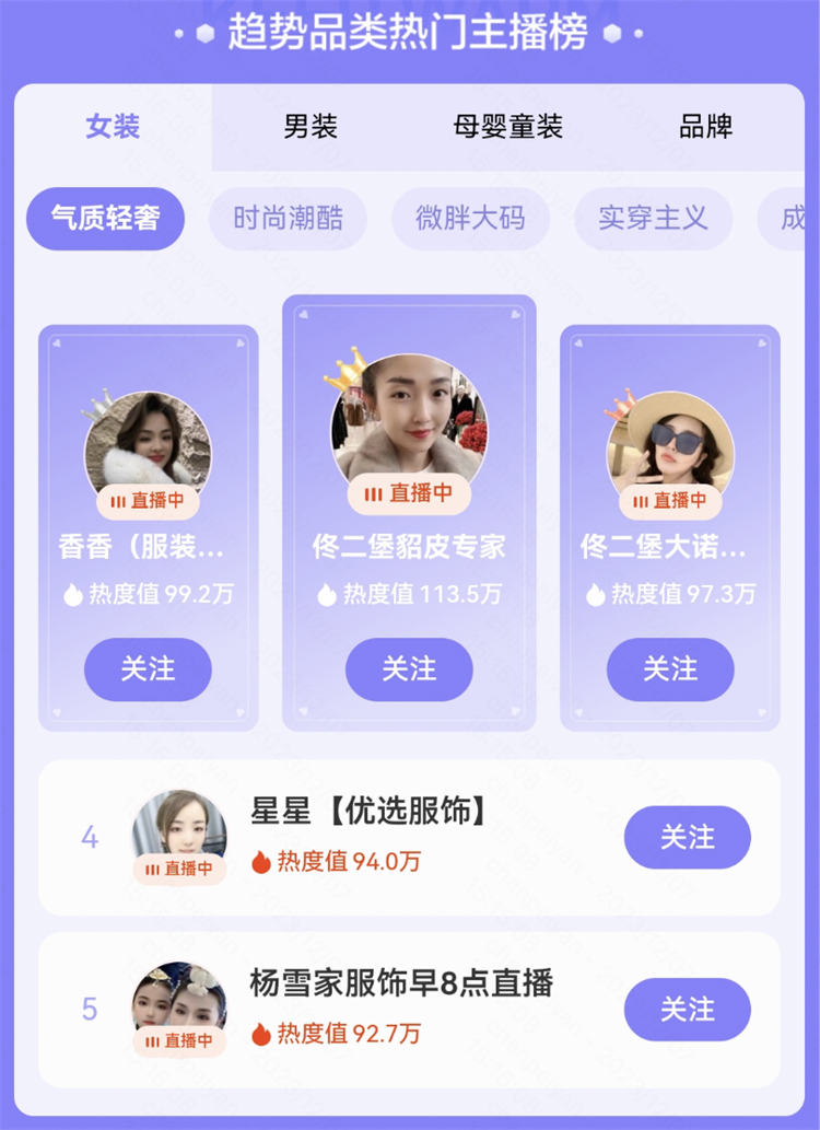 不僅設有品類榜單,還有“趨勢品類熱門主播榜”,各風格類目直播當天成交金額及消耗TOP5的商家即可上榜,優(yōu)質(zhì)商家可獲得主會場最核心位置。這樣的運營及設計,能夠讓優(yōu)質(zhì)商家被更多消費者“看見”,也能讓消費者購買到更多高性價比好物。