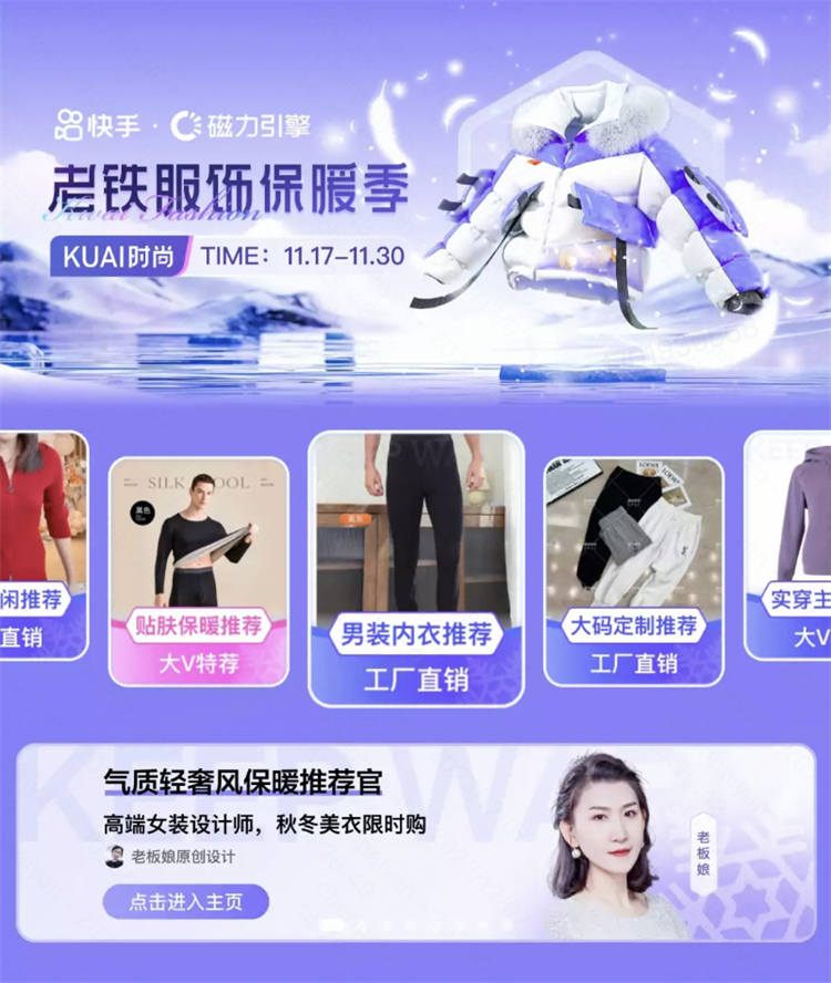 快手以“御寒好物限時搶,每日風格不重樣”為主題,策劃諸多主次場活動。在保暖季主會場,不同服飾風格類目推薦官分別向網(wǎng)友推薦不同風格單品,涵蓋氣質(zhì)輕奢、成熟休閑、實穿主義、時尚潮酷和大碼定制等。從時尚女裝到精致男裝,再到母嬰童裝,品類應有盡有。