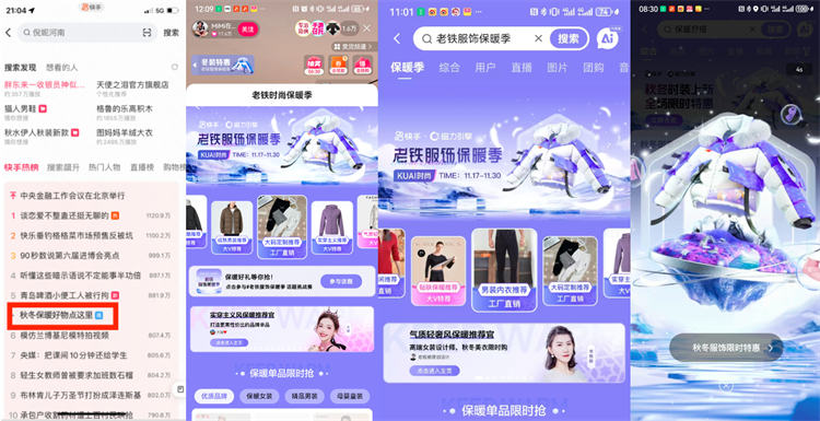 根據(jù)平臺用戶數(shù)據(jù)的起伏規(guī)律,快手提前預測到保暖服飾的消費需求將迎來高峰,于11月17日起便上線 “老鐵服飾保暖季”活動,帶來羽絨服、羊絨衫、保暖內(nèi)衣等全品類御寒保暖冬裝,及各類服飾風格趨勢榜,滿足消費者多樣化的購買需求。