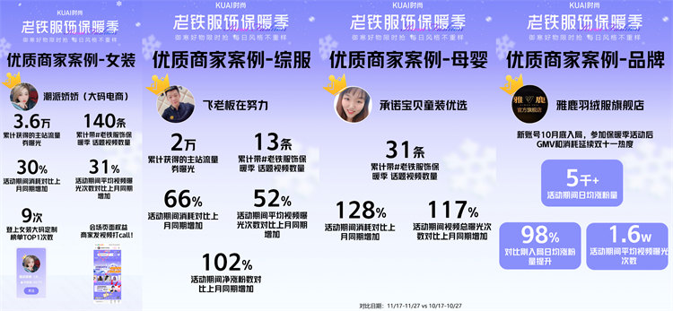 亮眼成績的背后,有達人和用戶的支持,有資源的供給,同時也離不開快手服務團隊的精心策劃?!袄翔F服飾保暖季”活動的成功,可以看到快手服飾營銷業(yè)務正形成一套從商品及主播篩選、到商家深度撮合、再到精細化運營指導的全鏈條的解決方案。