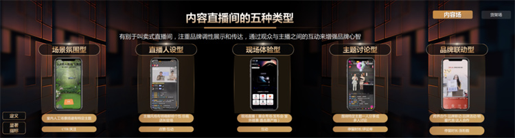 與此同時,品牌可以通過不同類型的內(nèi)容直播間提供多樣化的場景,包括場景氛圍型、直播人設(shè)型、現(xiàn)場體驗型、主題討論型、品牌聯(lián)動型。