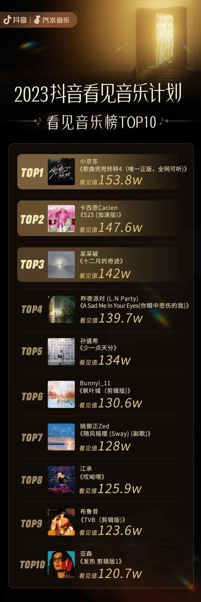 在本屆看見音樂計(jì)劃中,各大合作方與音樂人的表現(xiàn)都備受矚目,在這次盛典上,還有十首歌曲榮登看見音樂榜TOP10,其中包括小京東《兜兜轉(zhuǎn)轉(zhuǎn)》等熱門曲目。這些歌曲各具特色,展現(xiàn)了抖音平臺(tái)音樂的多樣性和創(chuàng)新性。