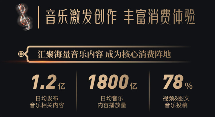如今抖音已成為音樂宣推必爭之地,每天用戶發(fā)布音樂相關(guān)內(nèi)容1.2億,播放量達(dá)到了日均1800億,其中使用音樂的作品比例高達(dá)78%。
