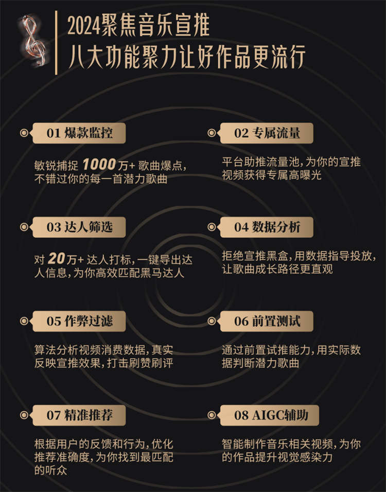 未來抖音將持續(xù)優(yōu)化平臺(tái)的宣推產(chǎn)品建設(shè),打通全鏈路。平臺(tái)將基于1000萬+首歌曲數(shù)據(jù)和AI分析技術(shù),打造潛力爆款識(shí)別模型;并充分調(diào)動(dòng)20萬+音樂創(chuàng)作者的推歌能力,建立爆款黑馬達(dá)人篩選模型,精準(zhǔn)、科學(xué)投放,促進(jìn)二創(chuàng)裂變;同時(shí)推出“創(chuàng)意工坊”,及時(shí)推送最新爆款玩法;除此之外,還有一大批獨(dú)家的音樂宣推資源,如音樂推薦位、熱榜、音樂詳情頁等等,提高爆款歌曲孵化的成功率。