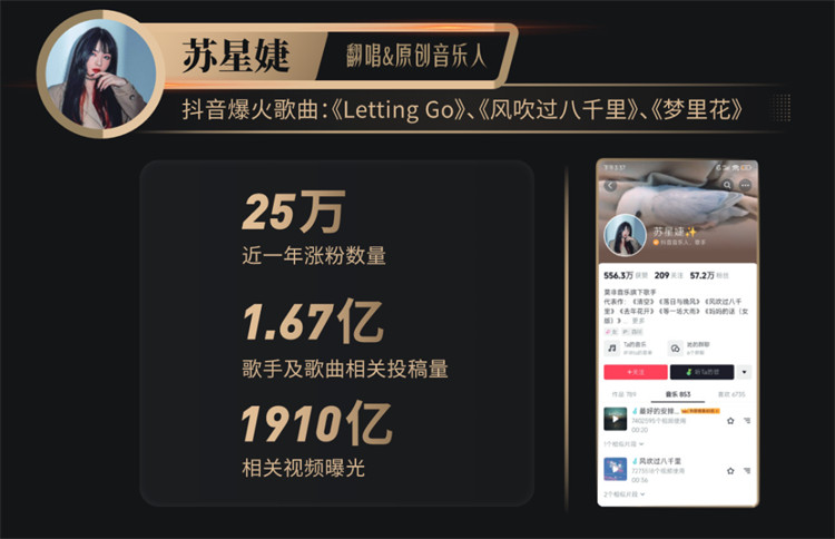 而對于懷揣音樂夢想的普通人,抖音也為音樂愛好者們提供了廣闊的空間,讓他們可以得到更多用戶的關(guān)注和青睞。作為抖音第一季尋聲計(jì)劃挖掘的出彩音樂達(dá)人,通過平臺(tái)的詞曲撮合、成長扶持等,歌手蘇星婕產(chǎn)出了抖音爆火歌曲:《Letting Go》、《風(fēng)吹過八千里》、《夢里花》等,近一年漲粉數(shù)量25萬+,歌曲在抖音已經(jīng)收獲超過1.6億次使用,相關(guān)視頻曝光量超1910億。