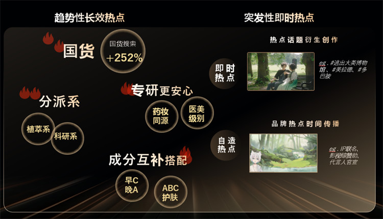 在熱點方面,品牌既可以把握趨勢性長效熱點如國貨、成分、專研,也可以把握即時熱點如#美拉德、#多巴胺,推動生意聲量雙增長。