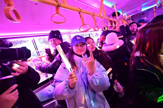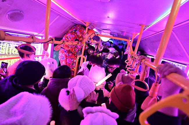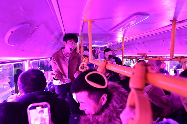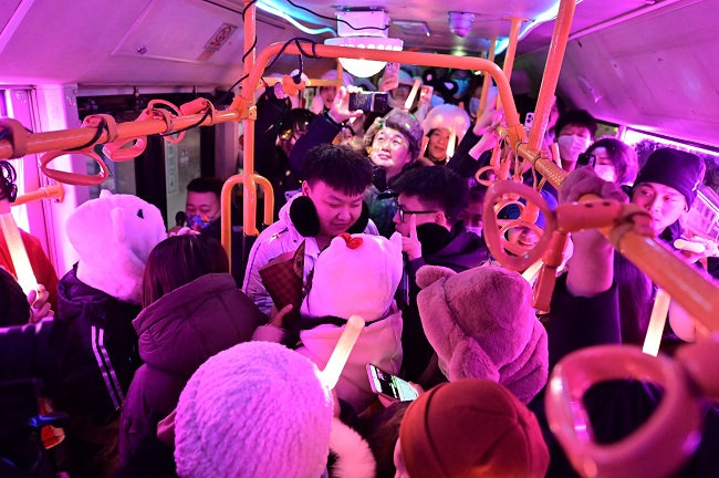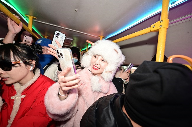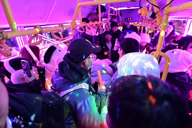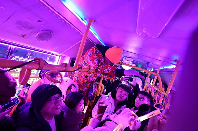 隨著車輛一路前行,坐在車上的每一個人,無論是南方來的小土豆還是對于蹦迪公交早就游刃有余的本地人,都在這支洗腦神曲的伴奏下,體驗著一種獨(dú)特的快樂。他們在這個特別的夜晚,把煩惱和寒冷甩掉,一起釋放自己的情緒。