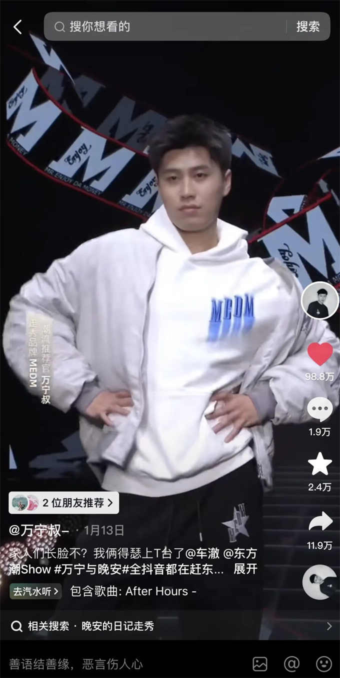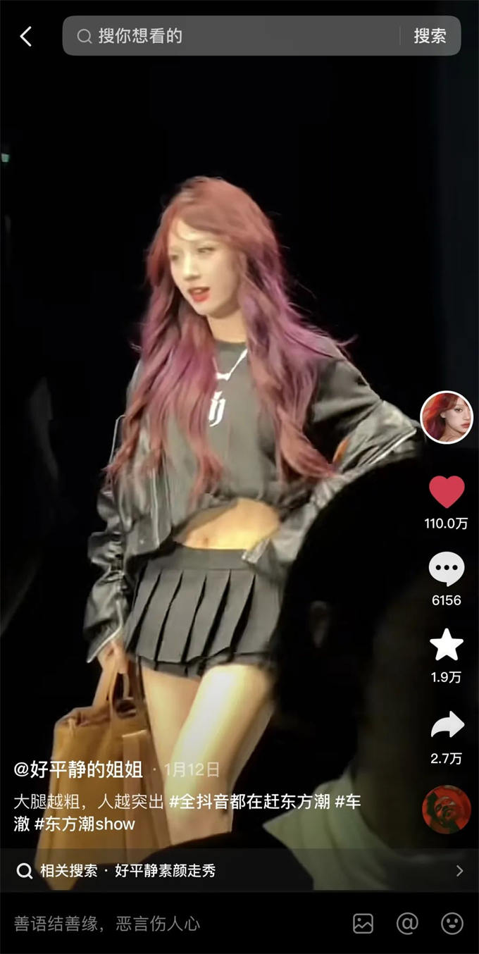 「一個品牌的傳播需要有一個支撐點的爆發(fā)」,這場“東方潮SHOW”直播盛典,既為品牌提供了爆發(fā)的支撐點、又助力品牌實現(xiàn)了知名度的提升。在直播當天,“東方潮SHOW”牢牢占據(jù)熱榜第一、全網(wǎng)榜第二,傳播聲量目前已經(jīng)來到了1.3 億且還在不斷攀升;而在眾多登臺走秀的優(yōu)質(zhì)達人中,他們大多在個人賬號上進行了相關(guān)的內(nèi)容創(chuàng)作,其中@好平靜的姐姐的單條視頻點贊量已經(jīng)超過了110萬,@萬寧叔-的點贊量也達到90多萬。