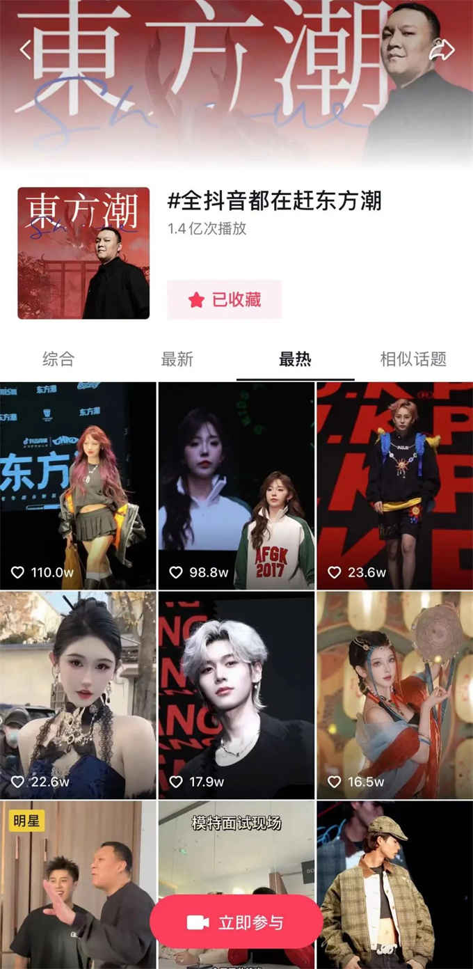 對于這場「非標準化」的大秀來說,抖in新風潮既是平臺的“搭建者”:搭建起一處聚集了代表品牌、優(yōu)質(zhì)達人與各領(lǐng)域消費者的交流場景,并在匯聚、傳播各方聲量的同時,持續(xù)吸引全新的消費群體入場;與此同時它又是大秀主題的“命題人”,無論是“龍年超有?!被顒舆€是此番“東方潮SHOW”,都是基于對潮流趨勢的探索與洞察:當傳統(tǒng)文化的演繹呈現(xiàn)出年輕化、大眾化的態(tài)勢,大眾對于“傳統(tǒng)文化”與”潮流文化“的結(jié)合產(chǎn)生期待,用恰當?shù)闹黝}凝聚群體、激發(fā)討論,同樣是這場大秀不可或缺的一環(huán)。
